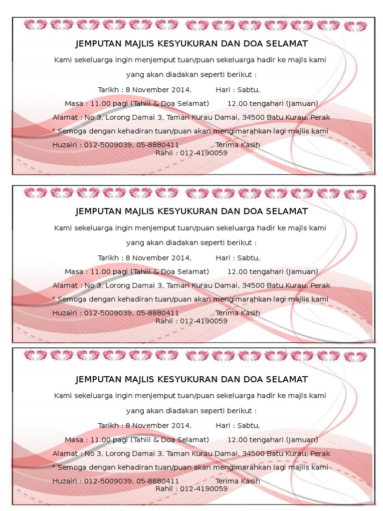 Surat jemputan surat cadangan dan sebagainya. Saya baca doa ni untuk majlis makan malam boleh tuan. Contoh Surat Rasmi Jemputan Mesyuarat Contoh Now Format 1600 x 1124 KAD JEMPUTAN TAHLIL PDF Document Format 1200 x 630 pixel Download Template Kad Jemputan Doa Selamat Format 904 x 2093 pixel Download Contoh Kad Undangan Kenduri Kesyukuran Format 1131 x 1600 pixel.
